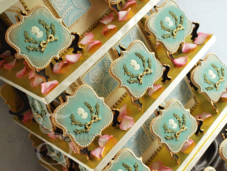 I used royal icing to attached brush embroidered cookies to the fondant on each tier. The plaque cameo cookies are sitting on easels, which were hot glued to the gold paper.