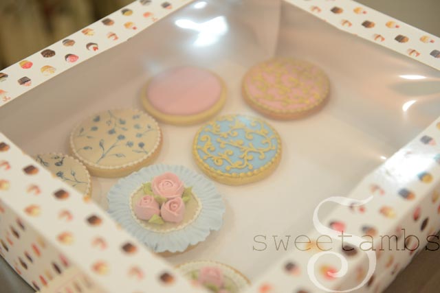 The 5th day of class was the advanced workshop. I squeezed a lot of material into one day! We made royal icing roses with a lacy brush embroidered border and some ruffles, piped filigree and painted it gold, and then painted tiny blue roses by hand. I made these cookies ahead of time so that I could show the students what we were going to make in class. I thought it would be best if they could see the cookies in person, so I took lots of photos (just in case) and then very carefully packed them in my suitcase. Even after being thrown onto a baggage carousel and flown across the Atlantic, every cookie arrived completely intact.