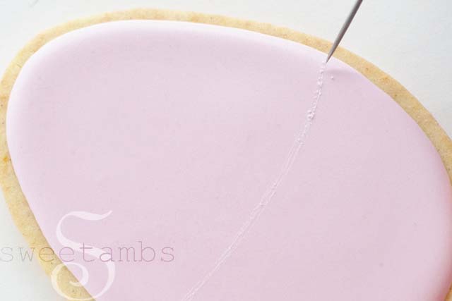 Allow the icing to dry 8-12 hours. Once the icing is completely dry, use the scribe tool to mark where the top of your basket will be by scratching a line in the icing. I made mine a little more than half way down. Notice the line is not perfectly straight, but curves down slightly.