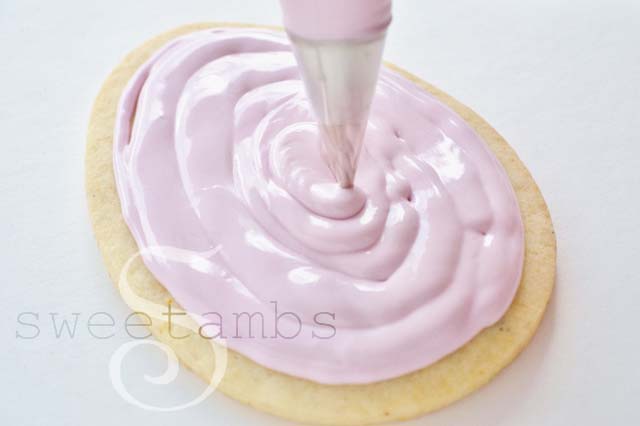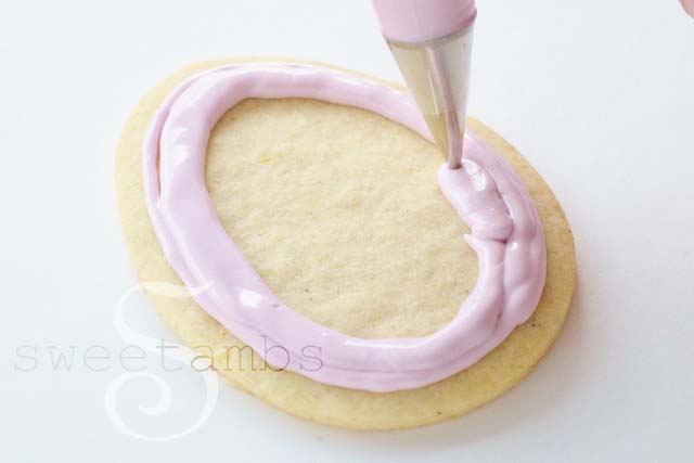 Then, use stiff consistency royal icing and a tip 3 to pipe a rope border for the handle. Watch the clip below for demo on piping a rope border. It’s basically a series of interconnected backwards “S” shapes.