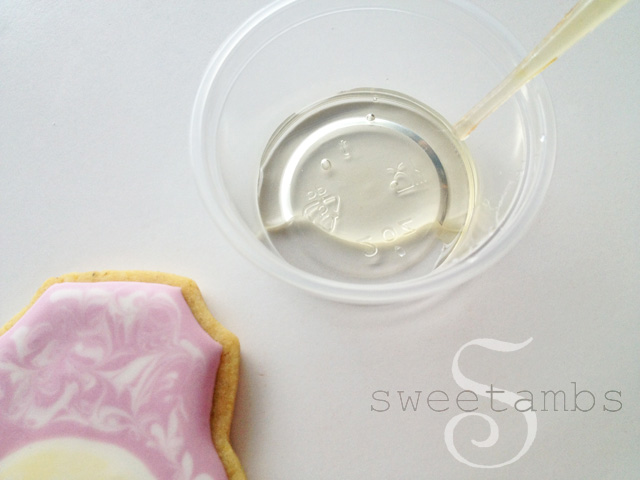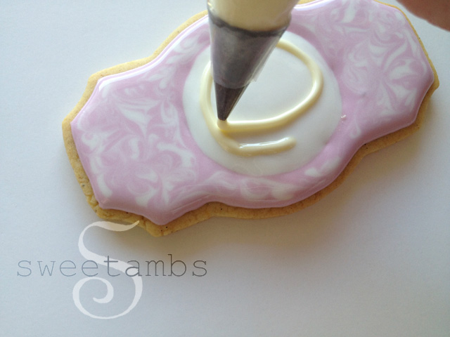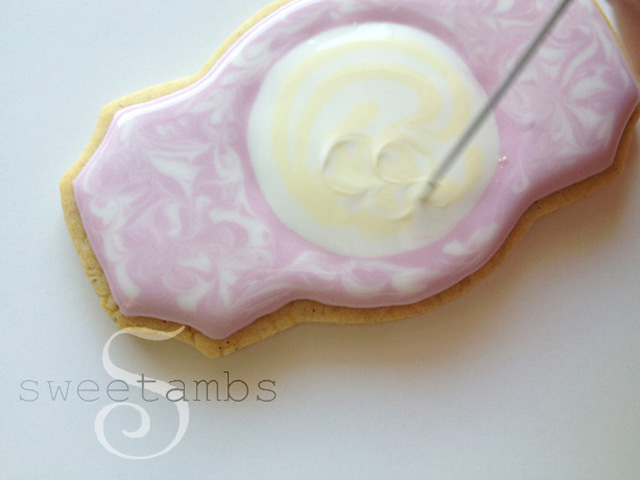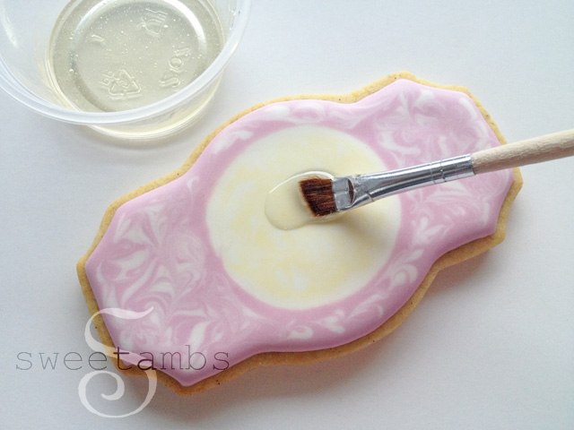 These cookies were inspired by the bejeweled Jay Strongwater frames that my grandmother has on display in her art gallery. In this tutorial, I’ll show you how to achieve this enameled look. You can see the entire set of cookies here. To purchase products used in this and other tutorials, visit the recommended products page. This plaque cookie cutters are available on Karen’s Cookies website. There are two sizes of this cutter available. I’m using the smaller one in this tutorial. Once your cookies are baked and cooled, use a scribe tool to trace a round cookie cutter in the center of the cookie to create a guide. Flood the area around the circle in pink icing and immediately pipe stripes of white flood consistency icing using a tip 3. You can learn all about flood consistency icing and how to use it in the video, Flooding With Royal Icing, which is available in my tutorial shop. Use the scribe tool to swirl the two colors together. You don’t have to wait for the icing to dry before moving on to the next step. Fill in the center circle with white flood icing and a tip 3. Immediately pipe pale yellow icing (I used a touch of golden yellow to make this color) over the white circle and swirl it around with the scribe tool. Allow the icing to dry completely, which takes about 8-12 hours. I usually ice my cookies and let them sit overnight before finishing the decorations. Mix some corn syrup with a few drops of alcohol to thin it out. I’m using Bacardi 151, but you can use any alcohol or flavored extract. Cover the entire surface with the corn syrup glaze. This is similar to the cracked glaze technique. Then, mix white pearl dust with a few drops of alcohol and use a small brush to place drops of it into the wet glaze. Swirl the pearl dust and glaze around with the brush. I added a royal icing transfer in the center. You could try using a fondant cameo, a monogram, or an edible image. Make sure to gently press the decoration into the glaze. I used the scribe tool to help position the bee in the center. There is a video in my tutorial shop on how to make this royal icing transfer bee. Let this dry for about one to two hours. You don’t want the glaze to dry completely because part of the beauty of this design is that the filigree sinks slightly into the surface. However, if the glaze is too wet, the royal icing will absorb the moisture and spread. Pipe a filigree design (step by step filigree tutorial coming soon to my shop!) using stiff consistency icing and a tip 1. The color of this icing is brown mixed with a touch of green added to neutralize it. When painting with gold pearl dust on royal icing, I like to start off with brown because it makes the gold really stand out. Read this post on how to make gold icing for more information about this process. Add a border around the circle and let the icing dry for about an hour. Paint the filigree and the border with a mixture of gold pearl dust and alcohol.