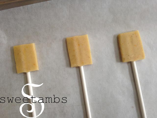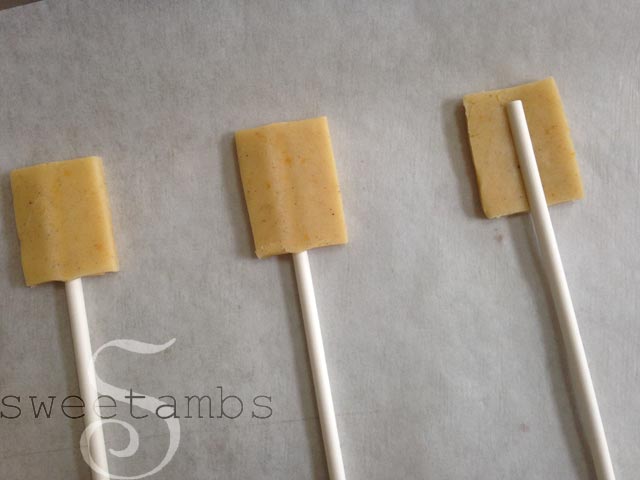 I used my Orange Vanilla Cardamom cookie recipe for this project. After you’ve cut out your cookies, use the scraps for the cookie sticks. I usually cut my scraps to about 1 x 1.5″ rectangles.
