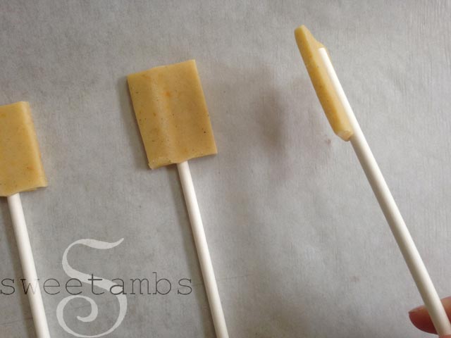 Instead of baking a cookie stick directly in a cookie, I find that it’s best to bake the stick in a cookie dough scrap and attach it to the cookie later. This prevents distortion in the decorated cookie (no indents!) and also provides added strength to the cookie pop (double cookie layer!). After experimenting with a few different ways to make cookie pops, this method is my favorite.