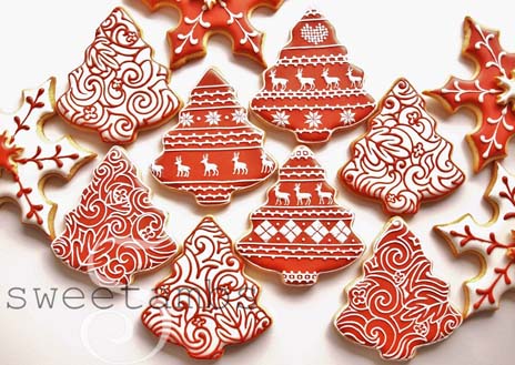 While trying to come up with a design for my Christmas cookies this year, my mom suggested that I use only red and white. A few days later, I saw this red and white tablecloth on my friends’ dining table. It became the inspiration for the filigree trees. ![]()